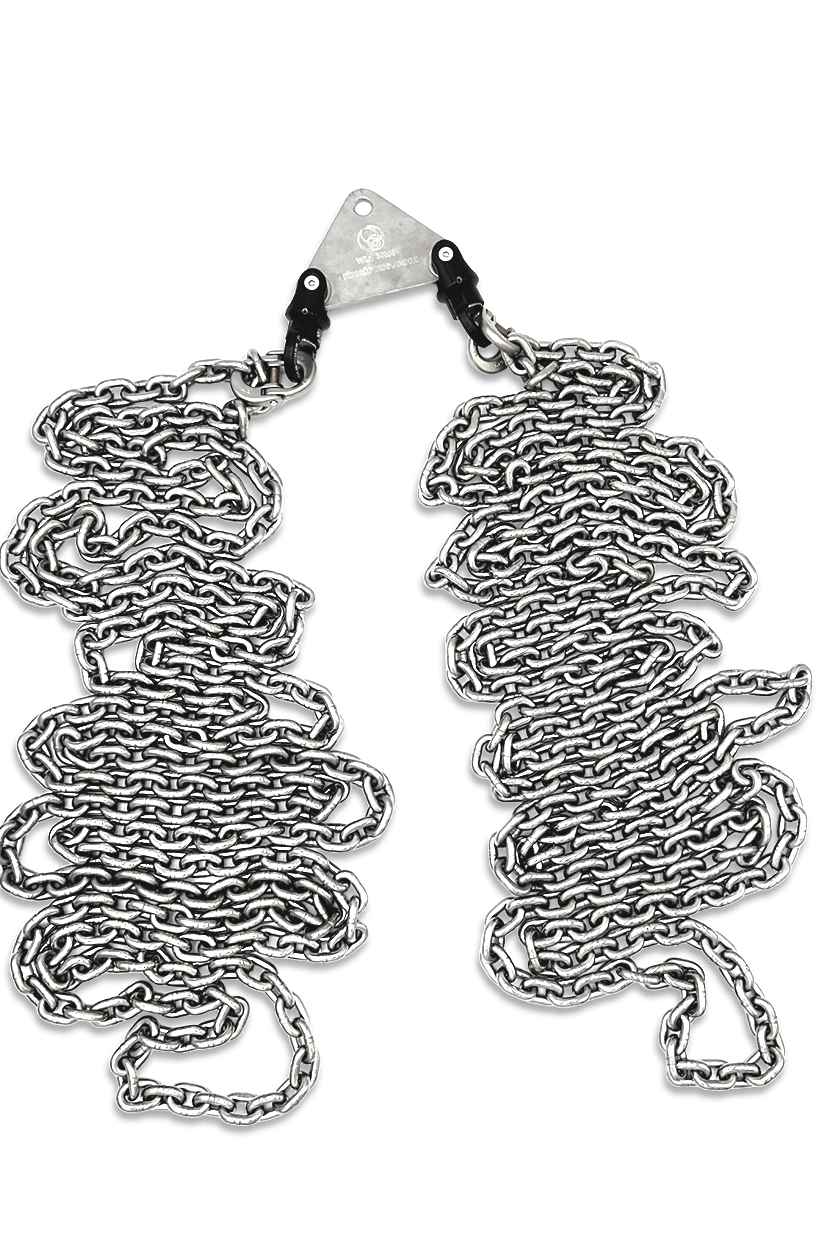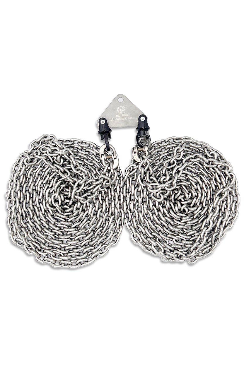 Our aerial chains are made from 8mm Grade 60 Stainless Steel Chain AISI318N duplex (WLL 1.55t each). The standard length of our chains is 2x 7m (2x 3.5m drop when rigged).